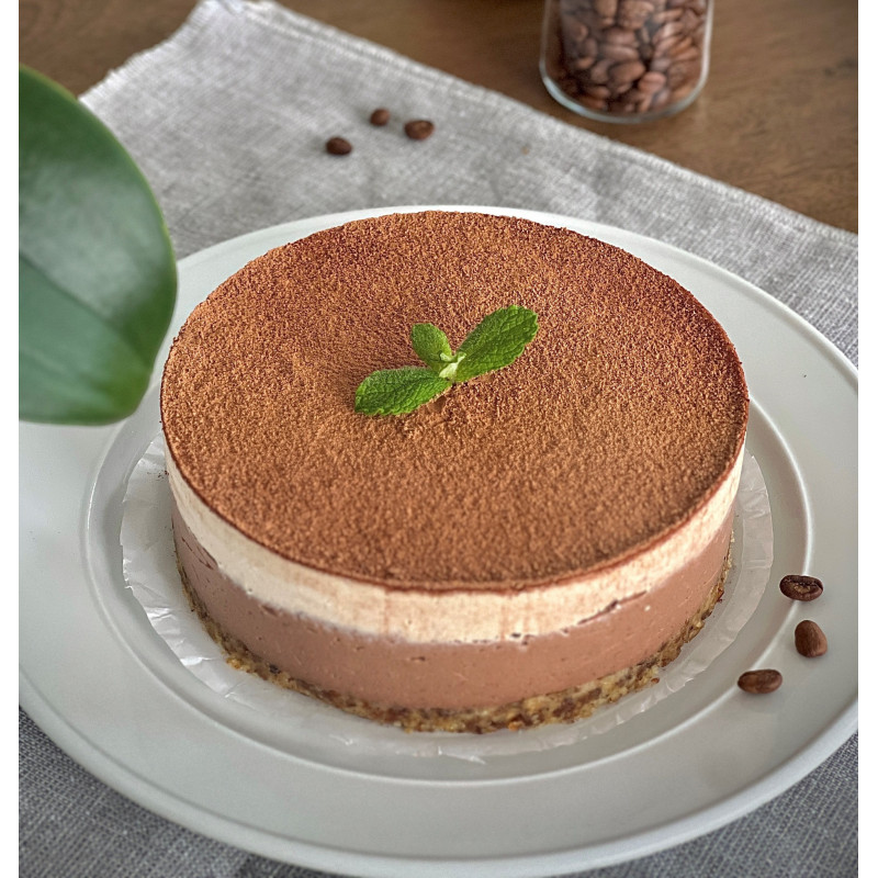 A luscious, guilt-free twist on the classic Italian dessert — layers of nutty chocolate mousse and creamy cashew filling on a rich walnut-date base, finished with a dusting of cacao.
